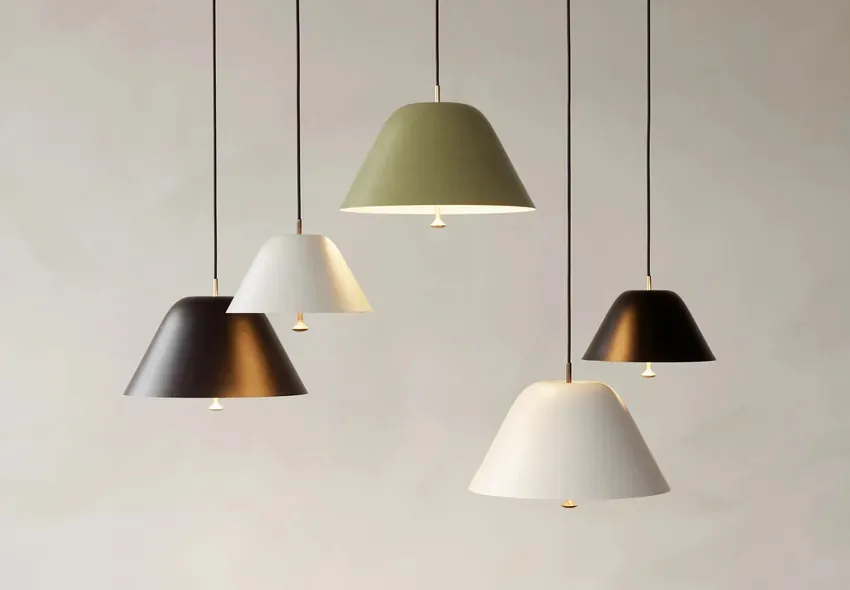 吊燈反射溫暖的環境光,完美照亮空間,似乎毫不費力地漂浮在空中。寬大的鋁製燈罩搭配優雅的玻璃漫射器,外觀經典,有各兩種尺寸與顏色可選擇或互相搭配,中心的銅色旋鈕更為燈飾完美加分。