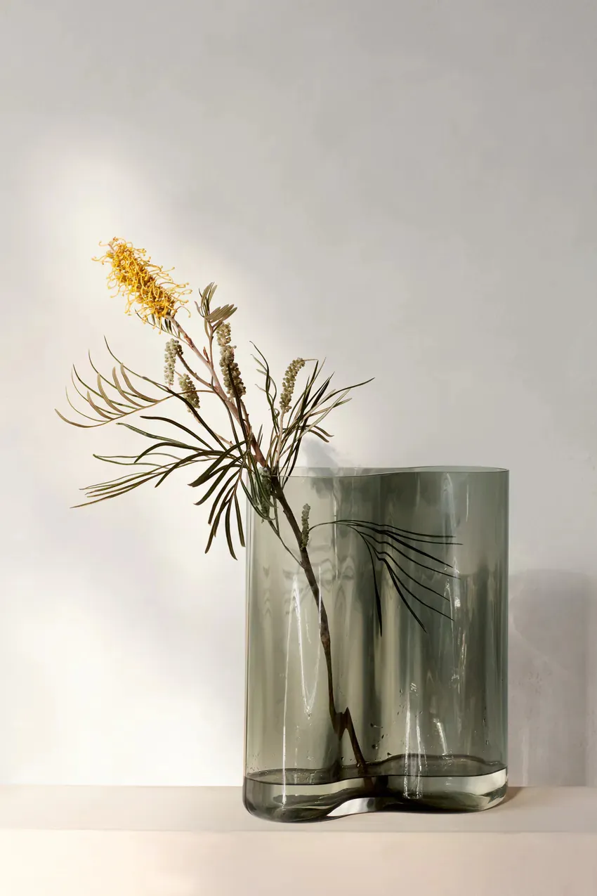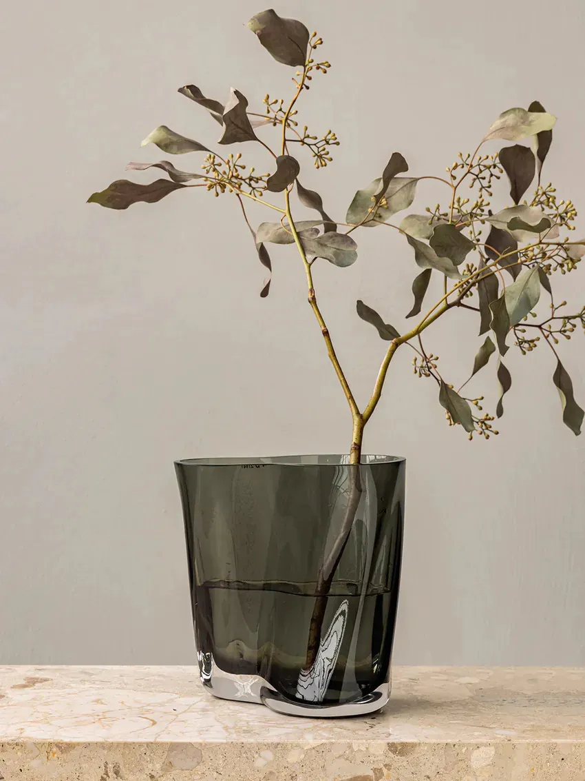 把簡約、雕塑美感和功能性結合在 Aer 系列中融為一體。花瓶的波紋狀、不對稱輪廓非常適合遠距離欣賞。它以液體般的波浪起伏,其設計類似於透過煙霧或薄霧看到的空氣的旋轉。煙色玻璃的底部逐漸變細,具有流動的觸感,輕輕地擁抱著花束,或是作為獨立的物體為空間增添雕塑般的吸引力。每個口吹花瓶都展現出不同的視覺特徵,反映了其獨特性。
