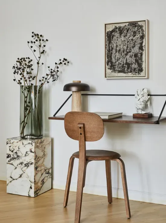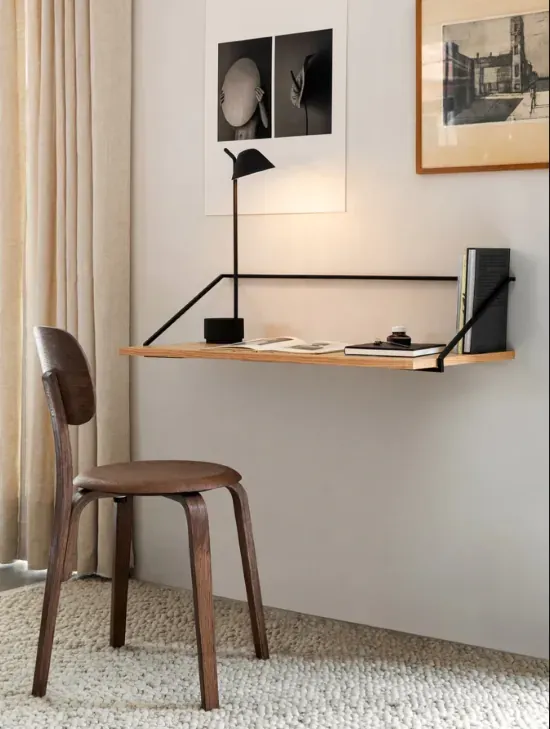 具有多種功能 ,作為書桌、櫃檯或書架,可以懸掛在您選擇的任何高度。幾乎適用於任何環境,可以巧妙地融入空間有限的起居區和臥室。極簡主義的鋼支架固定在牆上,並從樓梯的扶手上汲取靈感。木製平台有天然橡木或染色橡木可供選擇,與精密金屬製品形成觸覺對比。