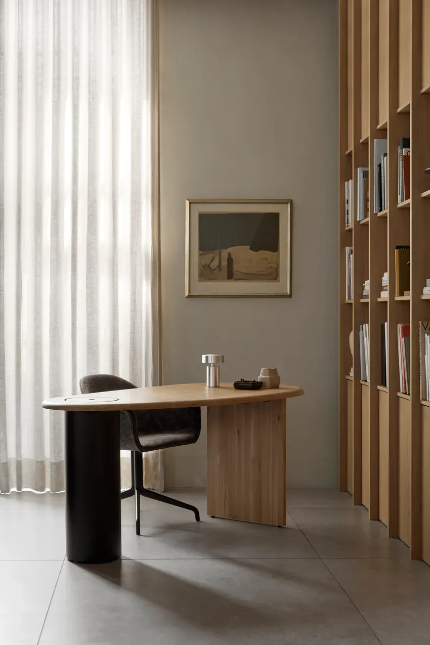 透過觀察海灘上的鵝卵石的形狀,找到了這件作品的靈感。創造一種非靜態的設計、一種顏色大膽但形式有觸覺感的設計。獨特的不對稱輪廓令人忍不住觸摸。桌面的有線孔蓋設計,大開下方是支撐鋼柱內的隱藏儲存空間,也確保桌面空間保持整潔。桌子的設計可單獨作為房間的裝飾品,或是辦公家具靠牆放置,有趣的形式吸引了人們的眼球注意。
