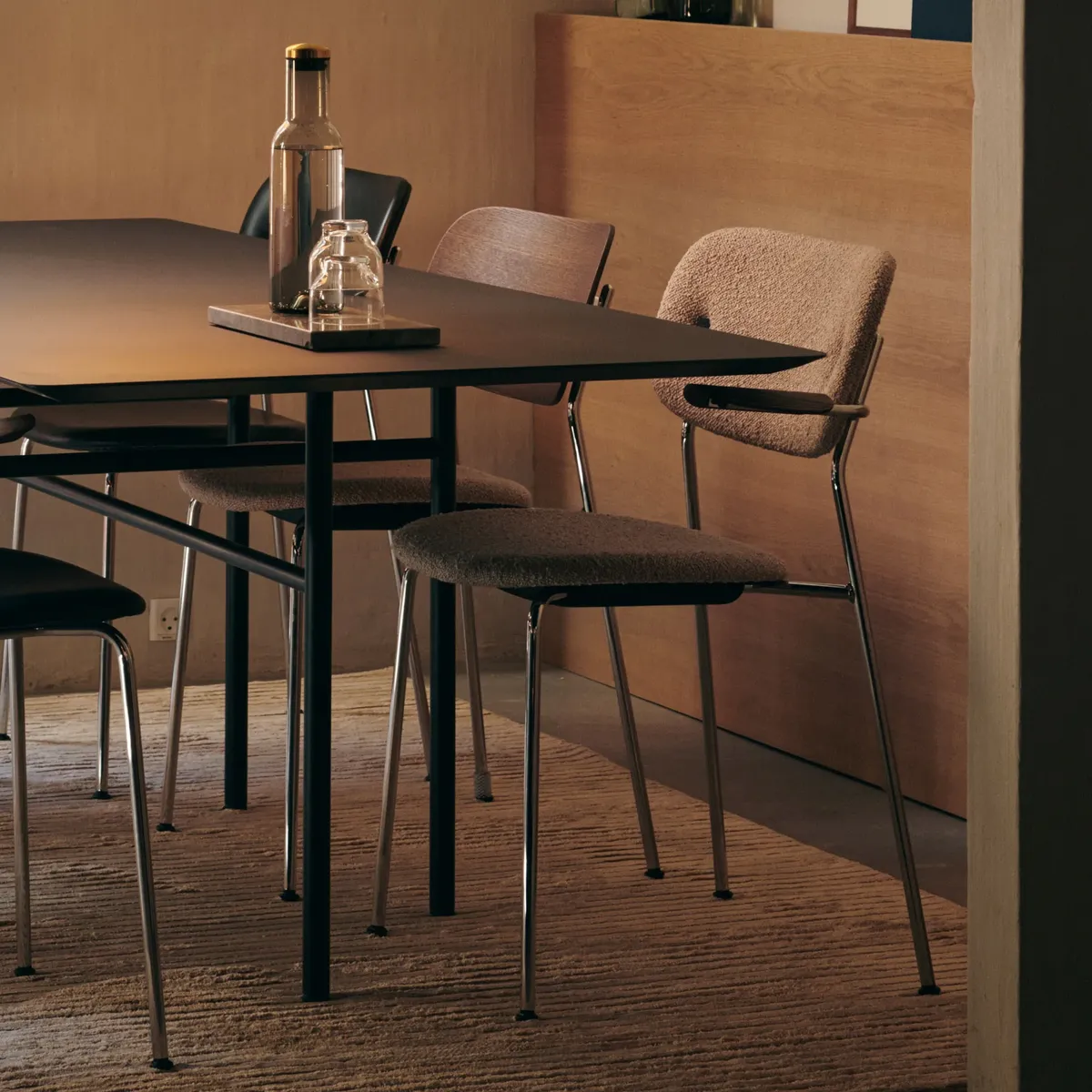 Co Chair 將輕巧、時尚的外形與出色的座椅舒適度結合在一起,寬大的單板靠背提供最大的舒適度,椅腳纖細而堅固的金屬框架定義了迷人的幾何輪廓,並且可堆疊最多 12 至 15 張椅子。從美學角度來看,以人為本的極簡主義帶入住宅和飯店中應用。