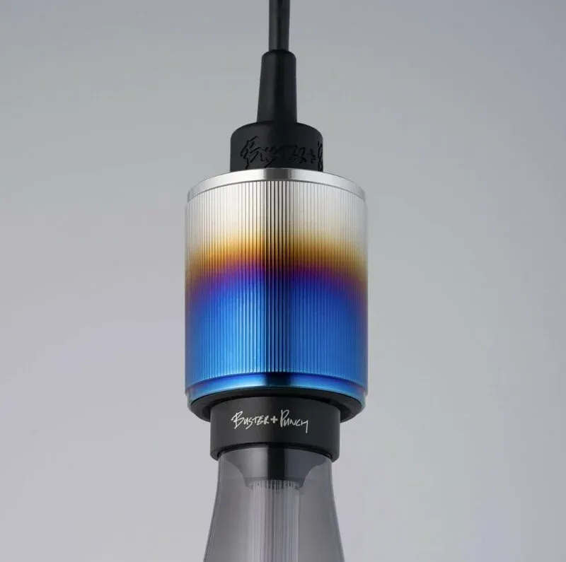由實心不銹鋼製成的輕型吊燈,獨特的燒鋼飾面,具有該品牌標誌性的鑽石切割線性滾花圖案。
