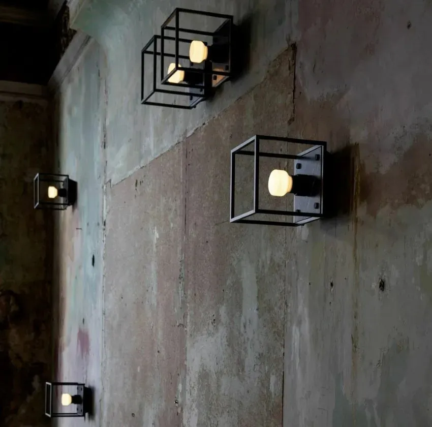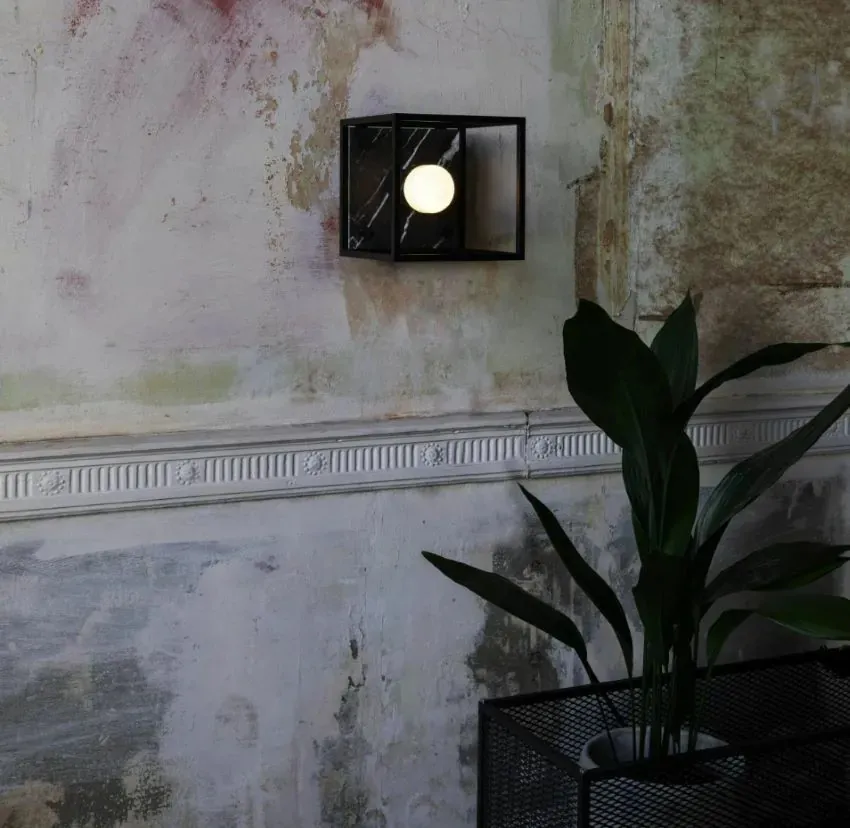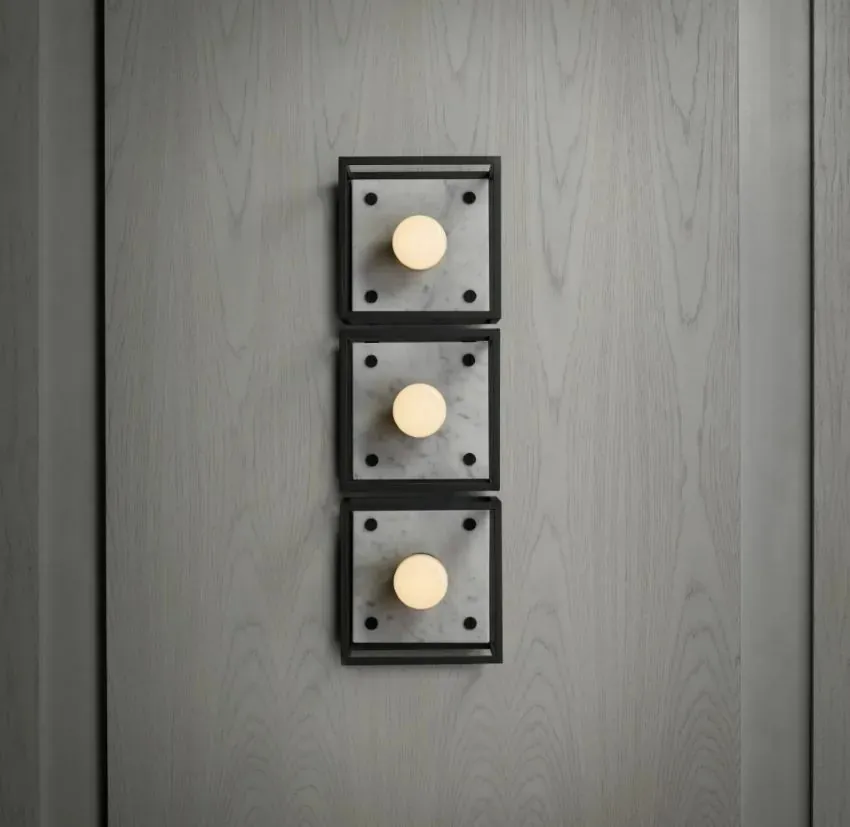由啞光黑色金屬製成的壁燈,並配有拋光的大理石背板。