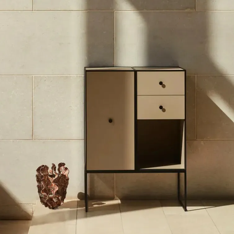 金屬立體框架底座,靈感來自於燭台,基於嚴格的數學公式並以最高精準度設計,可與Frame系統的櫃體搭配,打造梳妝台、書櫃、床頭櫃等不同組合。