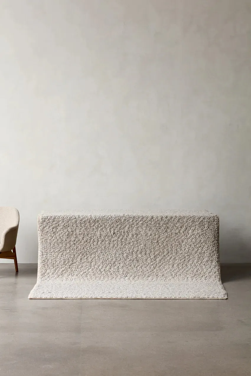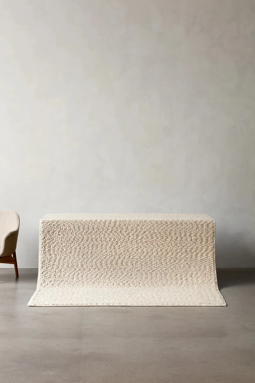 採用天然羊毛纖維精心製作而成,近看大小交替柔軟的毛圈,讓人聯想到在鵝卵石海灘上行走的感覺;但從遠處看,地毯的表面似乎像隨風搖曳的玉米田一樣起伏。天然材料柔化了地毯的整體表現力,適用於從私人住宅到公共場所的任何環境。