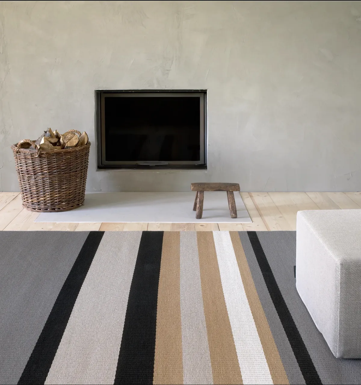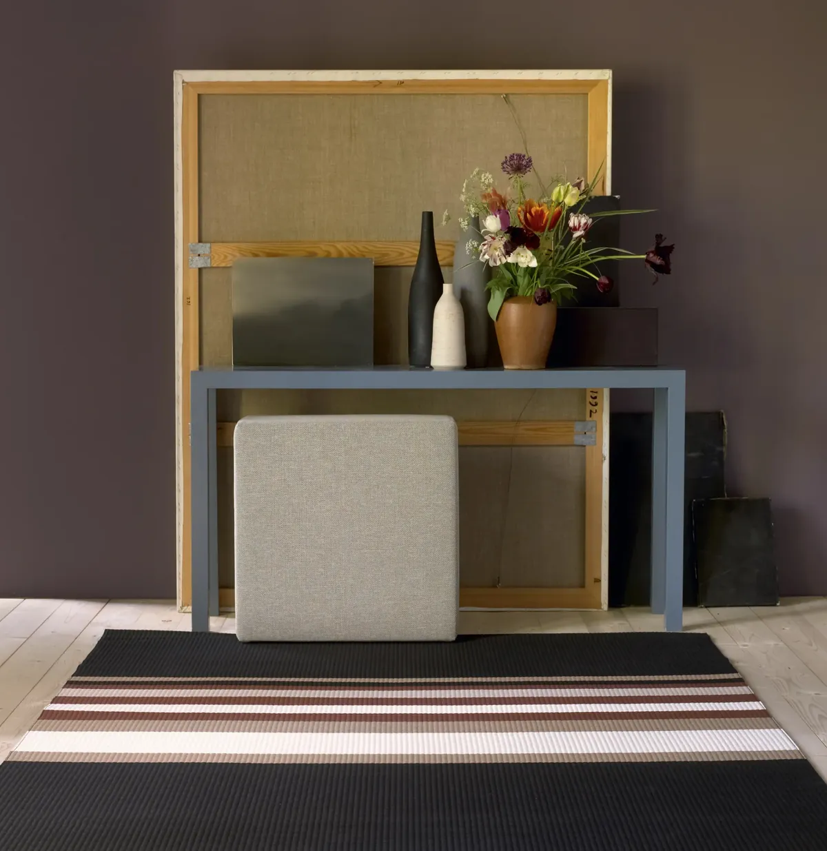 Horizon 地毯的多色條紋相對於地毯的長度不對稱地放置在單色底座上。條紋區域的寬度由地毯的長度決定,但始終至少為 90 釐米。