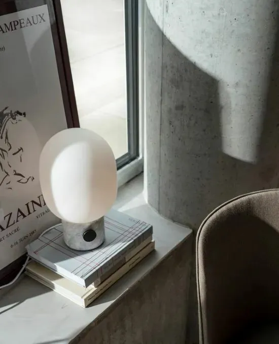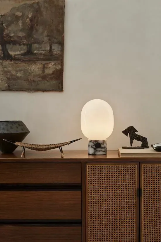 永恆的 JWDA 檯燈現在有美麗的 Calacatta Viola 大理石可供選擇。它的橢圓形蛋白石玻璃罩提供環境光,它位於 Calacatta Viola 大理石底座上,每件作品都具有獨特的醒目紫色紋理