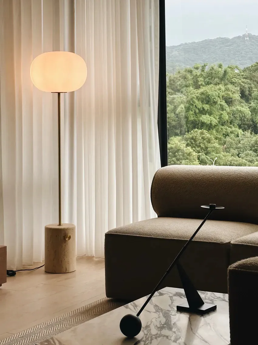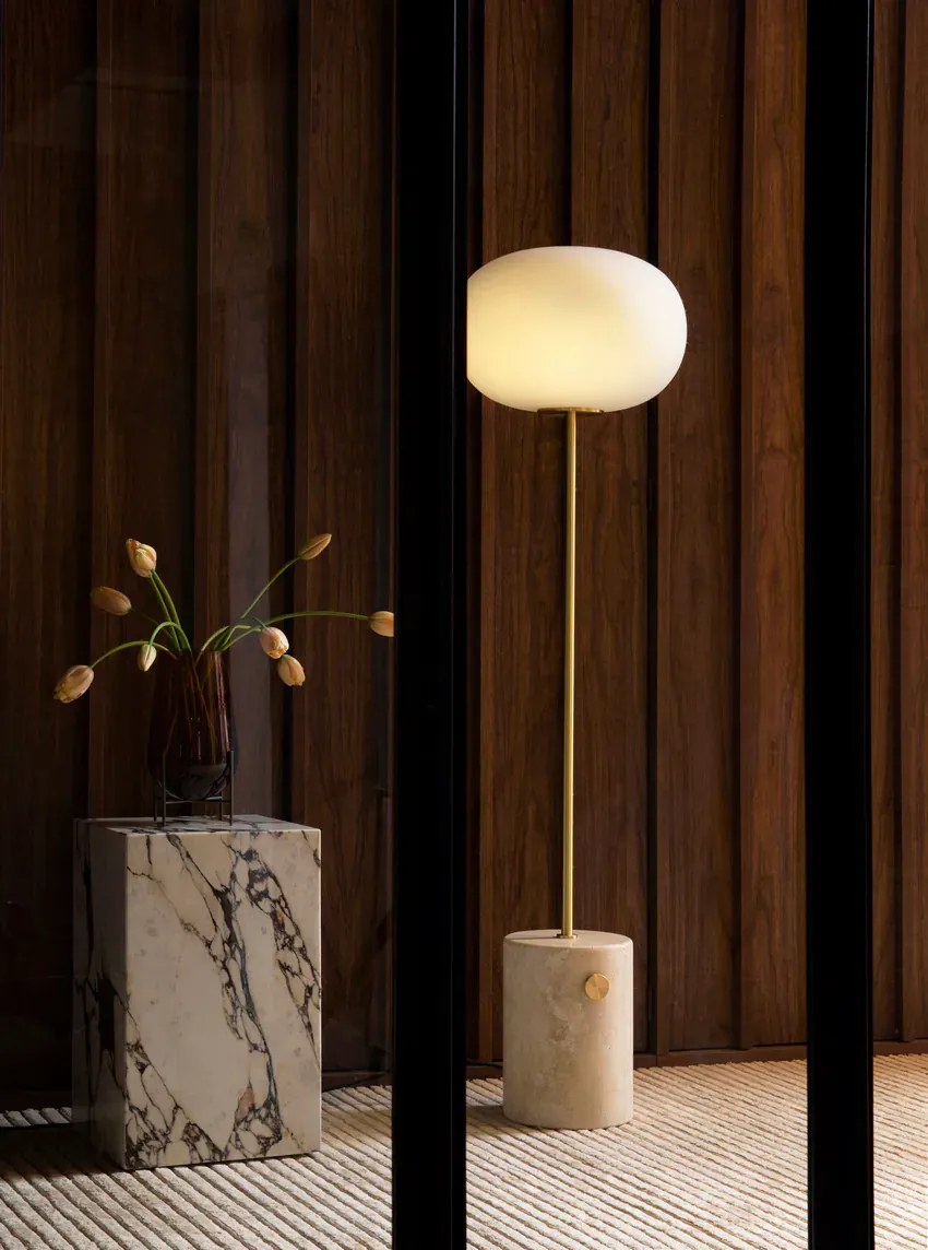 JWDA 落地燈是受傳統油燈啟發的照明系列。優雅而大膽的設計採用對比鮮明的材料製成,是精緻課程和幾何學的研究成果。橢圓形蛋白石玻璃燈罩、細長的金屬桿和配有調光開關的矩形大理石底座,共同構成了現代空間的永恆流動。