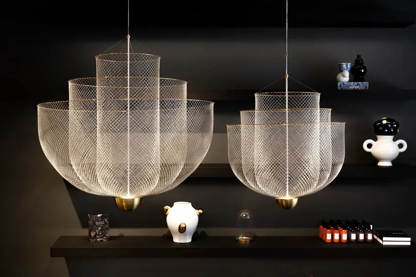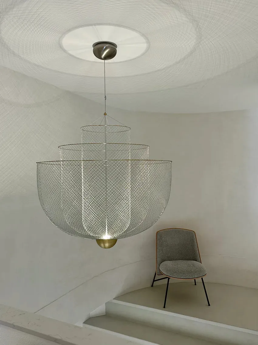 由一條條鐵絲,交疊錯落而成。輕薄而柔韌的材質,在三層造型美感中得到了延伸。穿透的視覺性,讓吊燈散發出優雅、柔和的光芒,投射在牆面上的光影也如湖水般平靜溫柔。