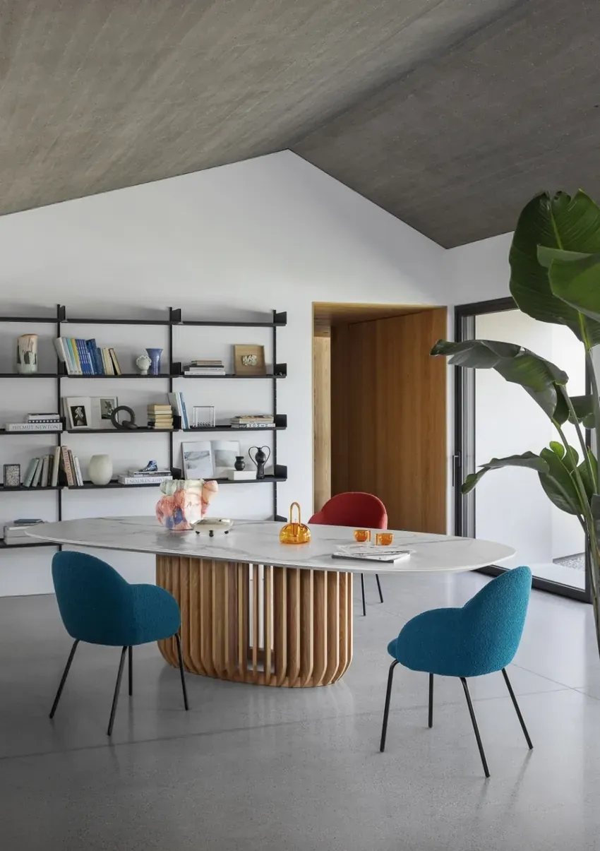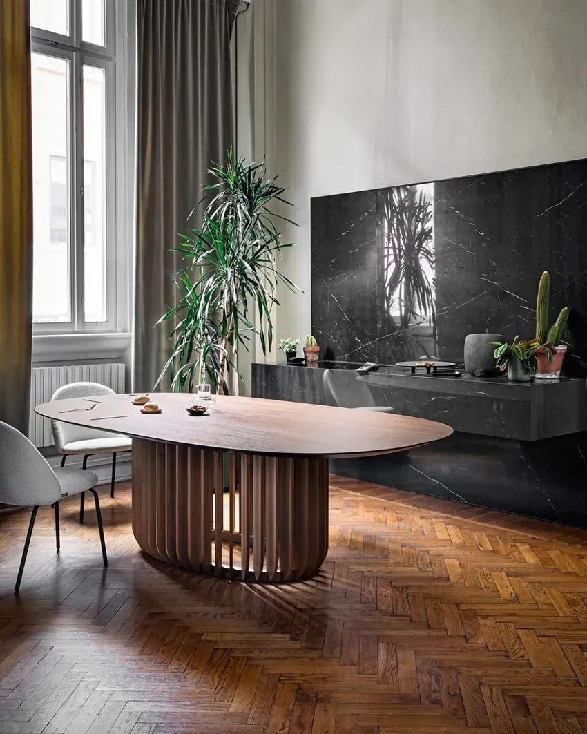 一張帶有冥想氛圍的桌子,在充實和空靈之間取得平衡,營造出寧靜的感覺。其精髓在於底座,長長的木質腿連接成一個環狀結構,成為空間的焦點。