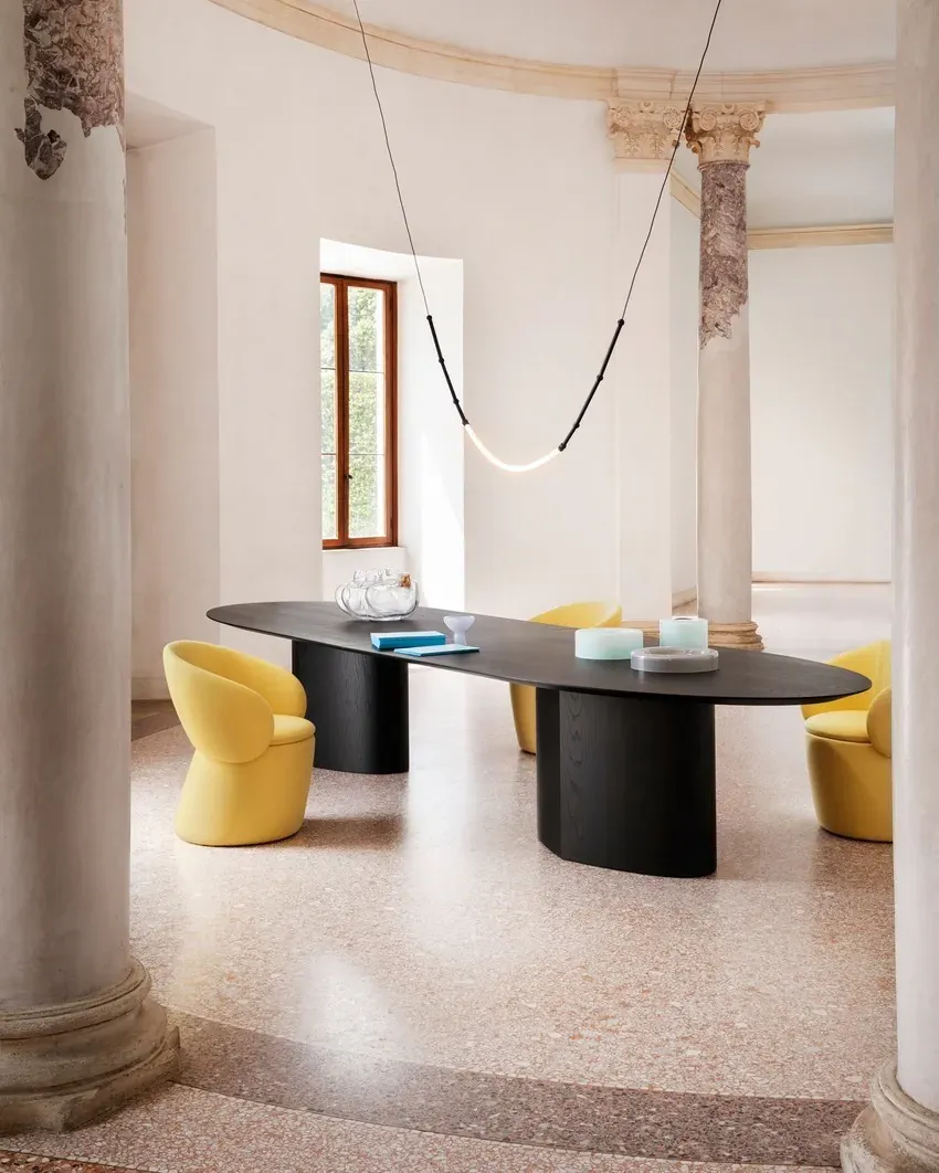 對於木材的讚嘆與讚美,特點為融在一體的葉狀腿,堅固的底座可支撐三種不同類型的桌面:圓形、橢圓形和有機形狀。每種桌面都提供不同的材質和尺寸組合選擇。