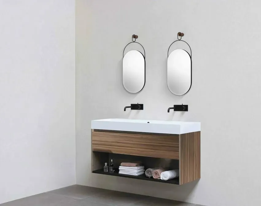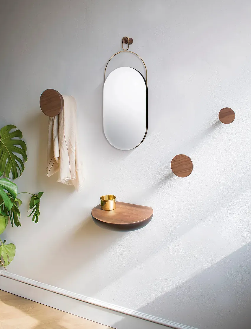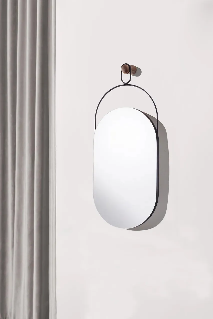 現代居家的精緻點綴,透過金屬桿垂直懸掛在牆面的木柱上。 既可以是一款實用的鏡子,也可以做為華麗的牆壁藝術品。