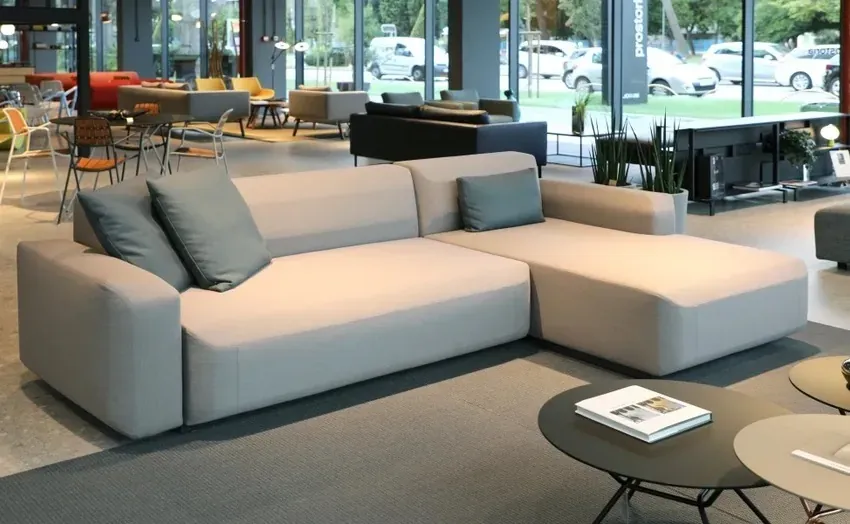 Fade 沙發床僅須將椅座背靠往前翻動,即可成為一張寬大的床鋪,L 型版本的貴妃部分亦可掀起成為收納空間。