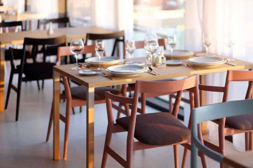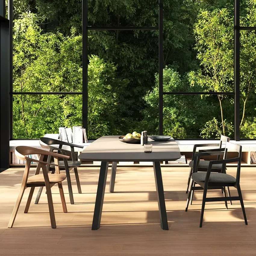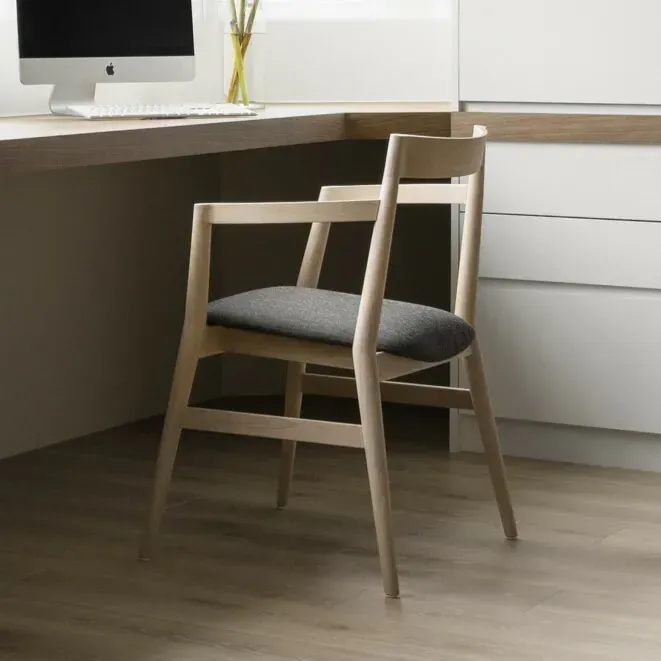 原木型體溫潤質感,在傳統類型木椅上帶有些微角度變化,搭配舒適的皮質或布質坐墊,造型簡約且精神。