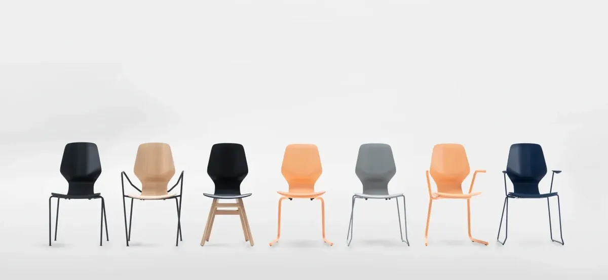 外殼的S曲線幾何形狀,提供良好的人體工學設計,由 2D 模壓膠合板製成,椅座為實木底座。方便堆疊彈性使用。