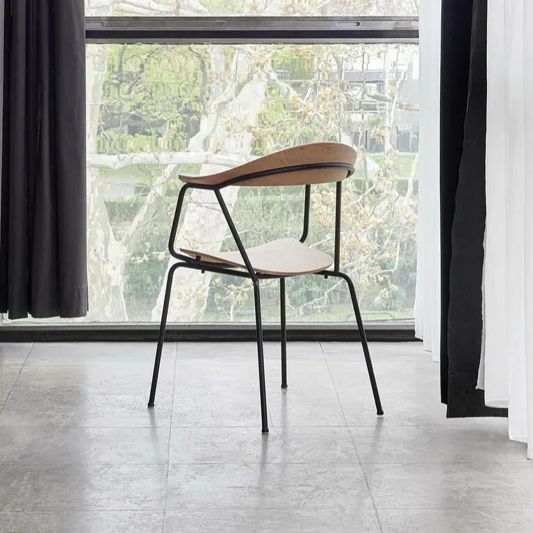 以輕盈、功能性和舒適性為主軸,金屬座身帶有擁抱的型態意象,包裹著木質靠背。無論用餐、辦公開會都適合,多色且可堆疊特性,讓椅身更顯輕盈俐落,釋放出更多空間可利用。