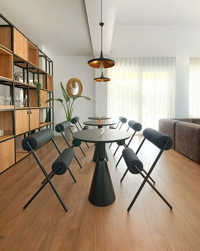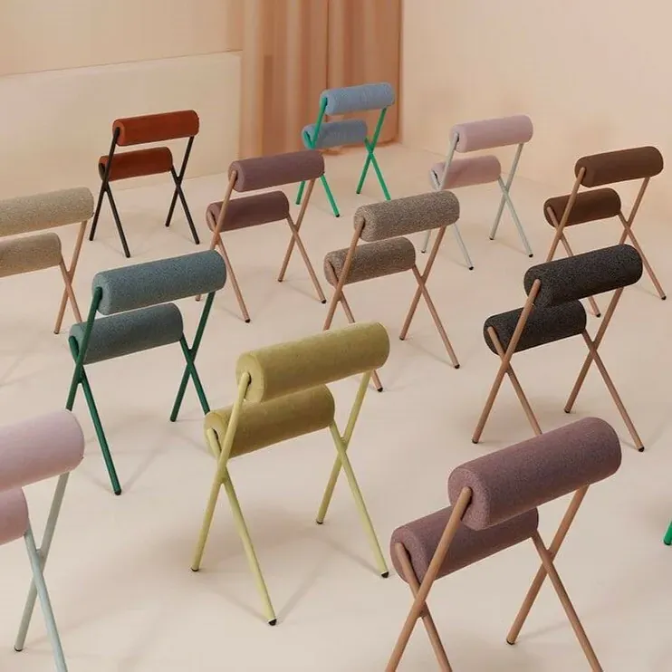 結合了平衡、美觀和功能,受到健身房中腿部推舉器材的啟發,將椅子的傳統形狀簡化為兩個純粹的元素:鋼管和圓柱體墊。客製化展現個性的可能性,亦可堆疊放大空間。